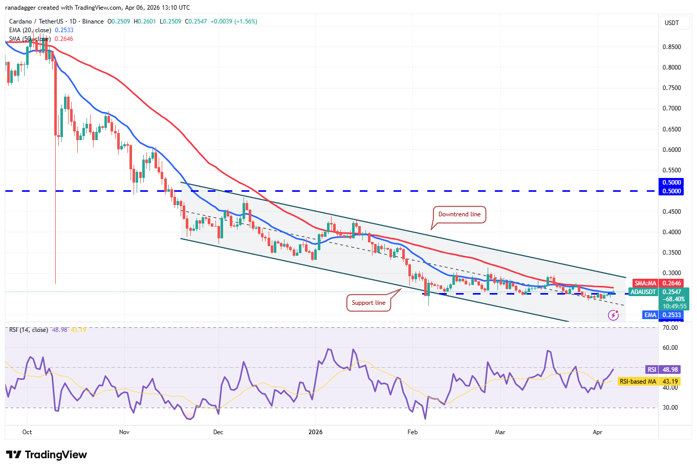 توجد مقاومة عند المتوسط المتحرك البسيط لمدة 50 يومًا (0.26 دولارًا)، ولكن إذا تغلب المضاربون على الارتفاع عليها، فقد يصل زوج ADA/USDT إلى خط الاتجاه الهبوطي لنمط القناة الهابطة. ومن المتوقع أن يدافع البائعون عن خط الاتجاه الهبوطي، حيث يشير الإغلاق فوقه إلى تغير محتمل في الاتجاه على المدى القصير.