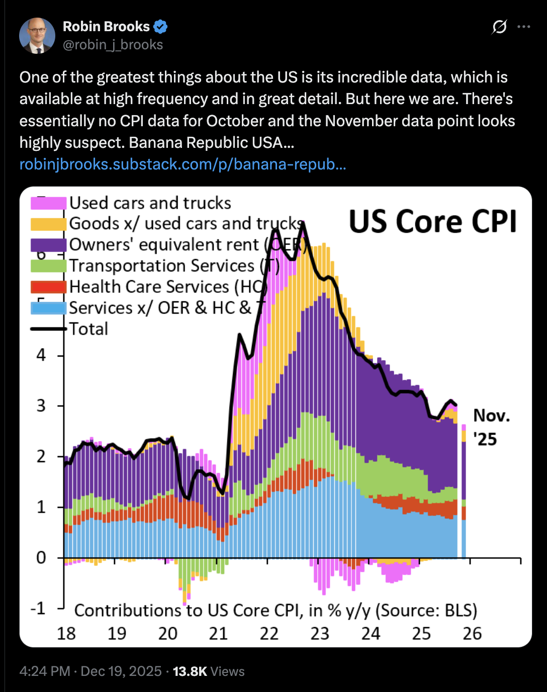 ومع ذلك، أدى الإغلاق القياسي للحكومة الأمريكية إلى تعطيل جمع بيانات مكتب إحصاءات العمل. ويخشى بعض الاقتصاديين، بما في ذلك روبن بروكس، من أن يكون ذلك قد شوه قراءات التضخم السنوية لشهر نوفمبر.