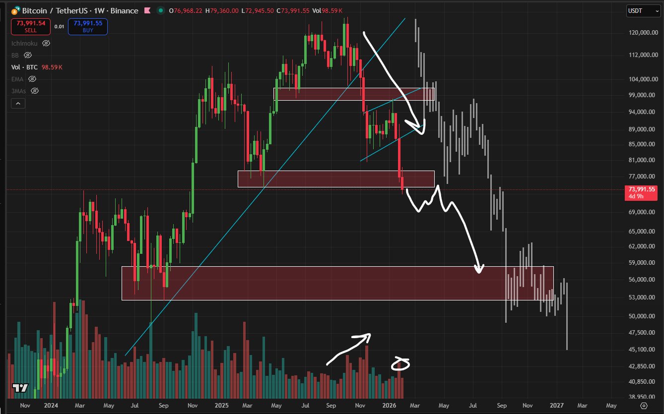“شمعة أسبوعية مؤقتة قبيحة للثيران. إذا أغلقنا أقل من 74 ألفًا – فمن الآمن أن نقول أن منطقة 50 ألفًا هي التالية،” كتب المتداول رومان في آخر تحليل له على X.