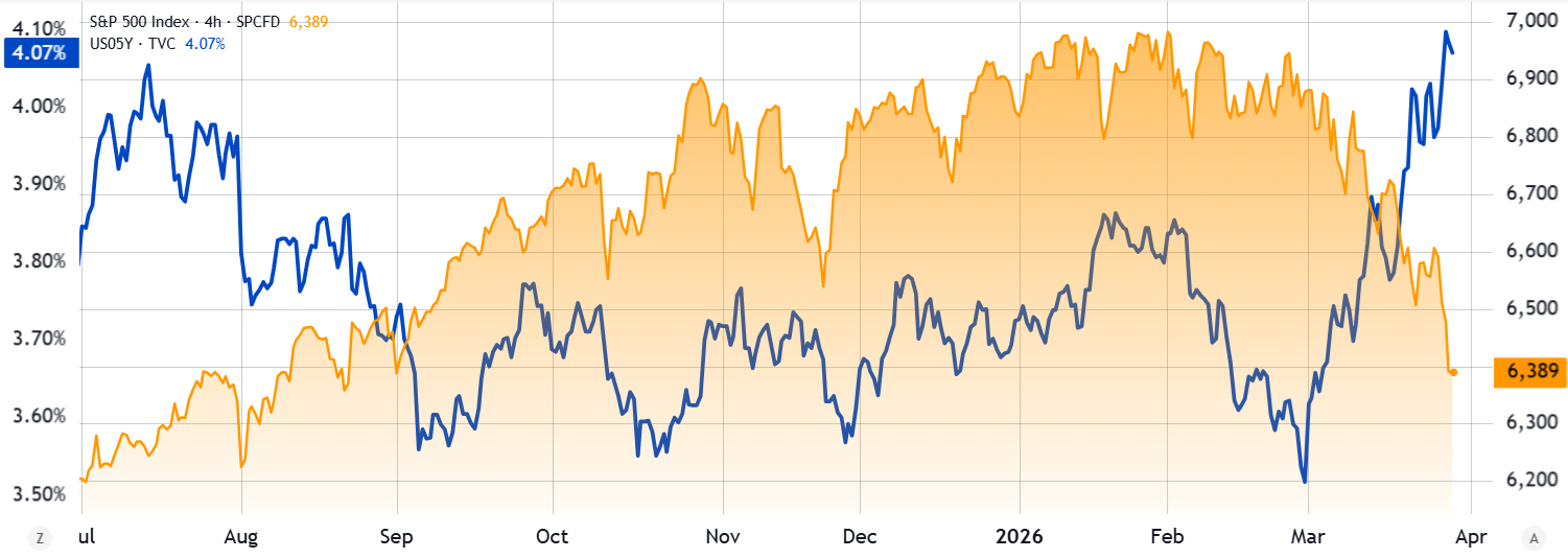 أدى ارتفاع أسعار النفط والإنفاق العسكري الأمريكي الإضافي المحتمل بقيمة 200 مليار دولار إلى مطالبة المستثمرين بعوائد أعلى على السندات الحكومية وسحب مؤشر ستاندرد آند بورز 500 إلى أدنى مستوياته منذ سبتمبر 2025. وارتفع خام غرب تكساس الوسيط (WTI) إلى 100 دولار يوم الجمعة، في حين وصلت عوائد سندات الخزانة لأجل 5 سنوات إلى 4.07٪، ارتفاعًا من 3.72٪ قبل ثلاثة أسابيع.