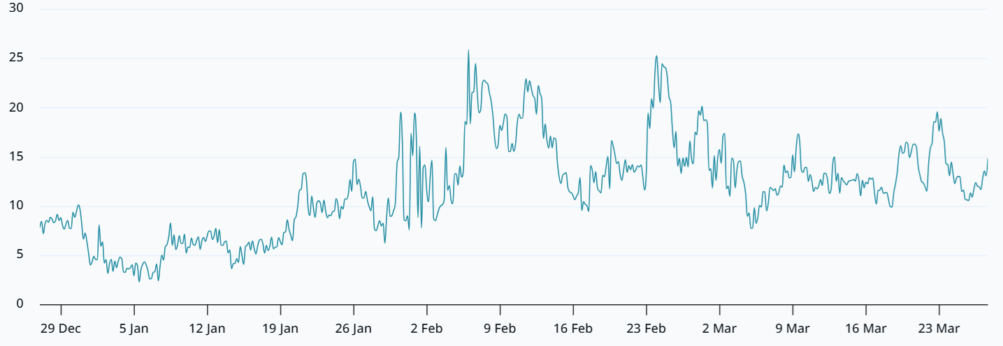 في يوم الجمعة، تم تداول خيارات (بيع) بيتكوين بتاريخ 24 أبريل بقيمة 66000 دولار عند 0.0566 بيتكوين أو ما يقرب من 3730 دولارًا. مع وجود احتمال ضمني بنسبة 53٪ لتداول البيتكوين بأقل من 66000 دولار بحلول أواخر أبريل، لا يزال المزاج هبوطيًا بالتأكيد بعد زيادة عدم اليقين في الحرب الأمريكية والإسرائيلية الإيرانية، مما دفع المتداولين إلى وضع تجنب المخاطرة.