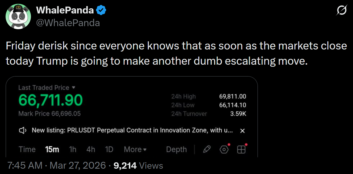 اقترح WhalePanda، مستخدم منصة التواصل الاجتماعي X، أن الانهيار في أسواق المخاطرة يتوقع أن يقوم الرئيس ترامب “بخطوة تصعيدية غبية أخرى” بعد إغلاق الأسواق الأمريكية. وبالتالي، فإن الخوف الحالي الذي نراه في سوق الخيارات يمكن أن ينعكس إذا لم تحدث أي أحداث جيوسياسية كبرى قبل يوم الاثنين.