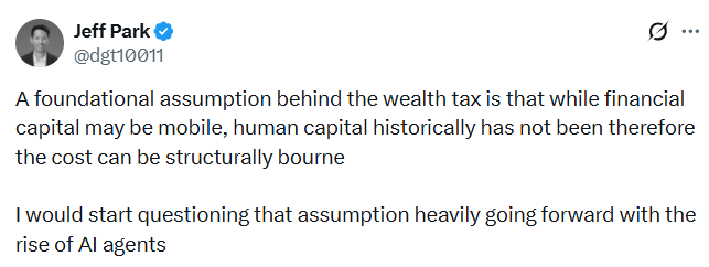 وأضاف: “يبدو لي أن رأس المال أصبح أكثر قدرة على الحركة من أي وقت مضى، وكانت ضرائب الثروة بمثابة إشارة لرأس المال – مثل التخلف عن السداد السيادي – أنه يمكن توقع المزيد في المستقبل”.