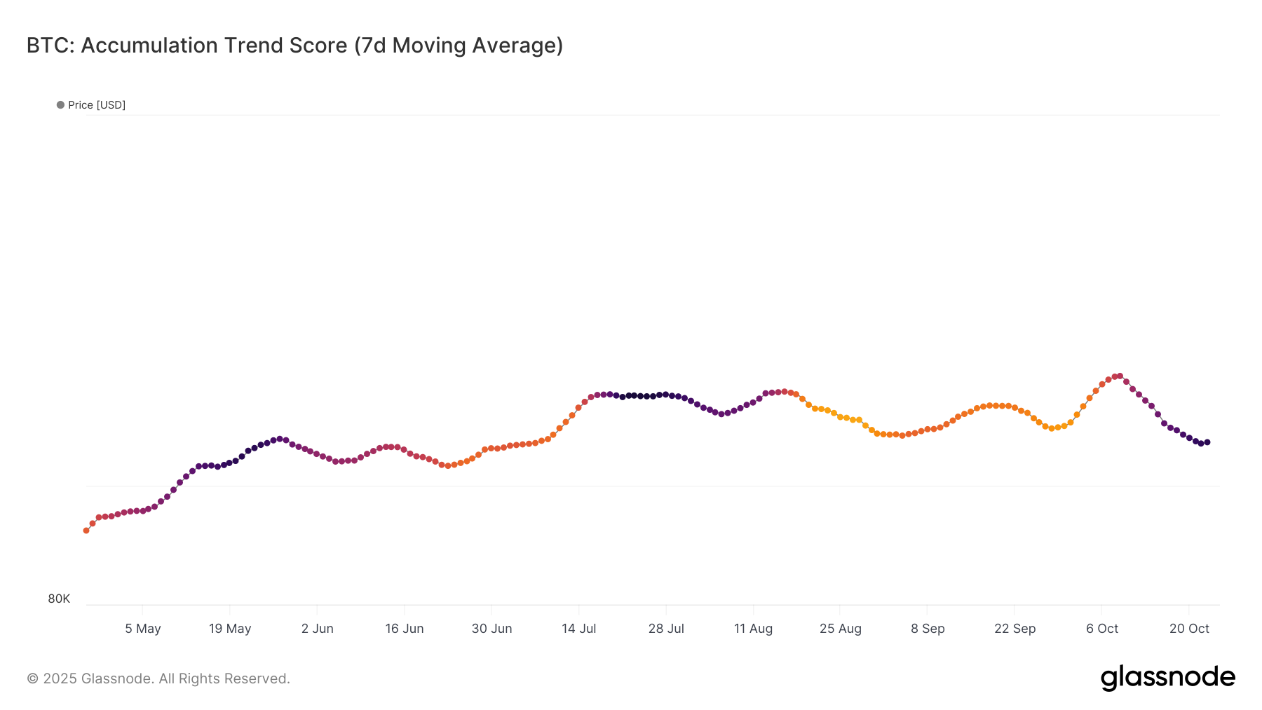 حاليًا، يُظهر مقياس درجة اتجاه تراكم البيتكوين الخاص بـ Glassnode أيضًا درجة 0.924 وأوضح مزود بيانات onchain أن “درجة الاتجاه الأقرب إلى 1 تشير إلى أن الكيانات الأكبر (أو جزء كبير من الشبكة) تتراكم بشكل إجمالي، وتشير القيمة الأقرب إلى 0 إلى أنها توزع أو لا تتراكم.”