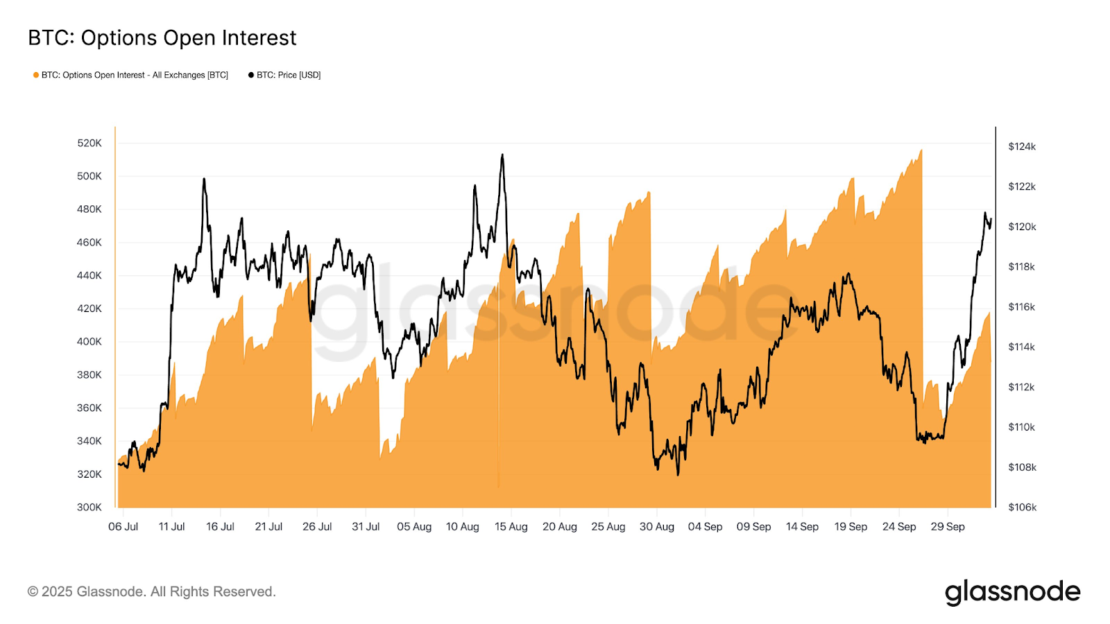 وفي الوقت نفسه ، فإن الاهتمام المفتوح لـ Bitcoin “Reset بشكل حاد” بعد انتهاء خيارات الأسبوع الماضي ، والذي قد “قد” يمهد المسرح “للربع الرابع ، وفقًا لمنصة Blockchain Data Glassnode.