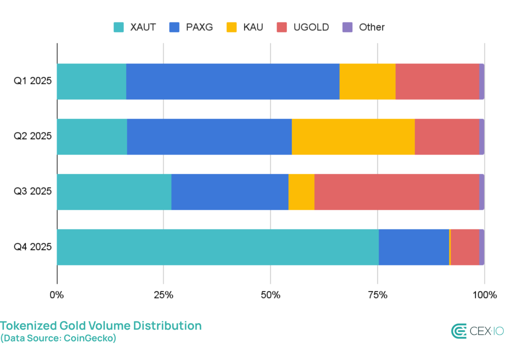 كان معظم الارتفاع في أواخر العام مدفوعًا بـ Tether Gold (XAUT)، والذي يمثل 75٪ من إجمالي حجم التداول، مرتفعًا بشكل حاد من 27٪ في الربع الثالث. وفقًا لموقعها على الإنترنت، تبلغ القيمة السوقية لـ XAUT 2.42 مليار دولار، وهي مدعومة بحوالي 1,329 سبيكة ذهبية، أو حوالي 16,239 كجم من الذهب المادي.