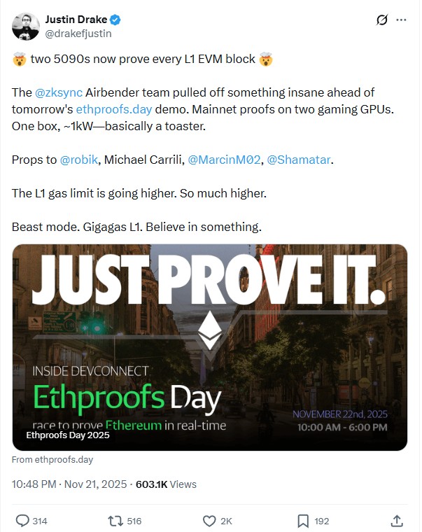 أظهر الباحث جاستن دريك أن التحقق من صحة البراهين على جهاز كمبيوتر محمول قديم أمر ممكن بالفعل في يوم EthProofs في Devconnect في نوفمبر. ومن المتوقع أن يقوم واحد من كل 10 مدققين بالتحول إلى ZK قبل نهاية العام.