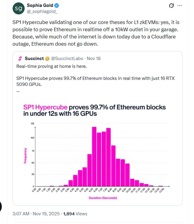 نظرًا للمعدل المذهل للتقدم في هذا المجال، قد تكون هذه المواصفات أعلى من المطلوب: في شهر مايو، استغرق الأمر 160 وحدة معالجة رسوميات من SP1 Hypercube لإثبات الكتل في أقل من 12 ثانية. يمكن لفريق ZisK الآن إثبات الكتل في 7.4 ثانية باستخدام 24 وحدة معالجة رسوميات، بينما يمكن لفريق ZKsync Airbender إثبات كتل الإيثريوم في أقل من 50 ثانية باستخدام وحدة معالجة رسومات واحدة، وإن كان ذلك بأمان أقل مما هو مطلوب.