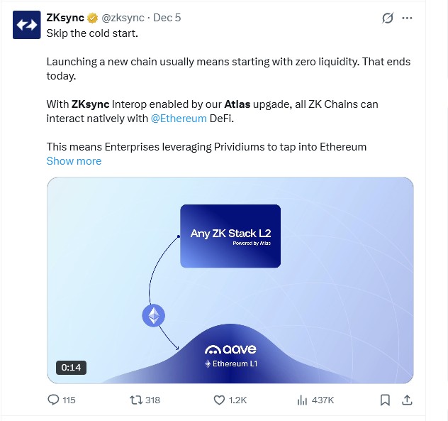 “تاريخيًا، كان على كل لغة L2 أن تقوم بتمهيد سيولتها الخاصة، وتدوير جسور منفصلة، وإعادة بناء نفس مكدس التمويل اللامركزي، وهو أمر غير فعال من حيث رأس المال ومحفوف بالمخاطر. باستخدام Atlas وGateway، يمكن لسلاسل ZKsync الاستفادة من سيولة Ethereum مباشرة في الوقت الفعلي تقريبًا، بدلاً من تجزئتها عبر مجموعات معزولة. تستغرق معاملات L2↔L2 حوالي ثانية واحدة، ويتم الآن إتمام عمليات نقل L1↔L2 بشكل أسرع من عملية نقل واحدة كتلة الإيثيريوم.”