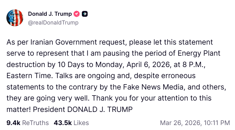 وأعلن الرئيس الأمريكي دونالد ترامب، الخميس، تمديد وقف إطلاق النار على البنية التحتية للطاقة الإيرانية لمدة 10 أيام حتى 6 أبريل، مشيرا إلى المفاوضات البناءة الجارية.
