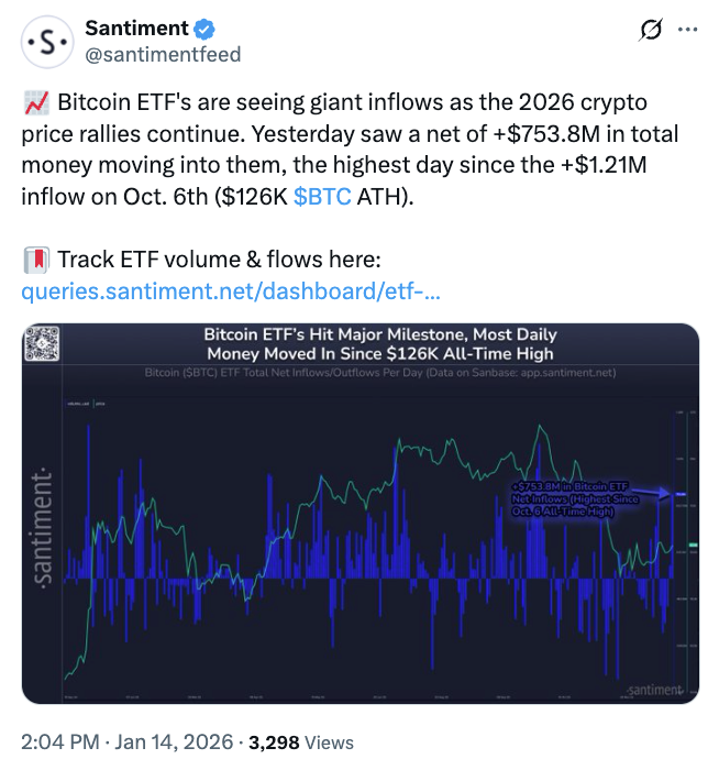 وكانت التدفقات الواردة يوم الثلاثاء البالغة 754 مليون دولار هي الأكبر منذ 7 أكتوبر، عندما شهدت صناديق الاستثمار المتداولة في بيتكوين الفورية تدفقات بقيمة 875.6 مليون دولار، وفقًا لـ SoSoValue.