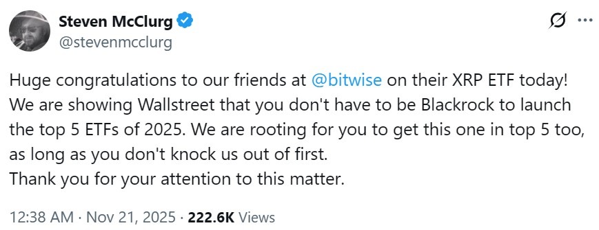 هنأ ستيفن ماكلورج، الرئيس التنفيذي لشركة Canary، شركة Bitwise على الإطلاق، قائلًا إنهم “يدعمونهم” على الرغم من كونهم منافسين في هذا المجال.