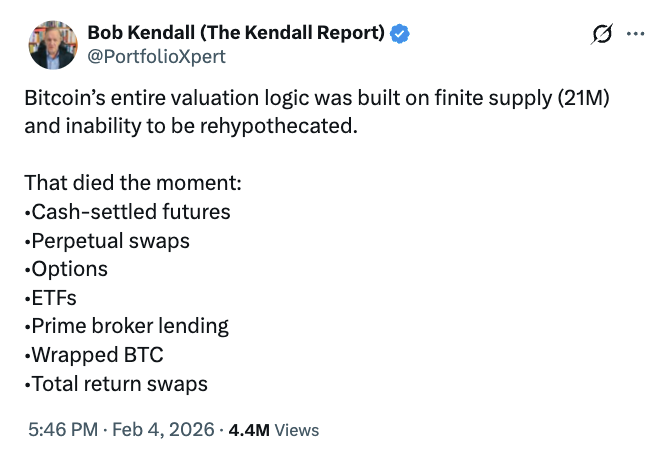 قال بوب كيندال، المحلل الفني ومؤلف تقرير كيندال، في منشور يوم الأربعاء X: “يمكن لنفس عملة البيتكوين الواحدة الآن دعم وحدة صندوق استثمار متداول، وعقد مستقبلي، ومقايضة دائمة، ودلتا خيارات، وقرض وسيط، وسندات منظمة. كل ذلك في وقت واحد”.