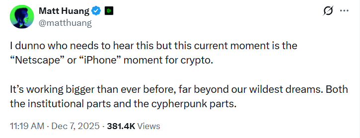 تقترب صناعة العملات المشفرة من لحظة “Netscape”، حيث يؤدي التقدم المطرد في البنية التحتية لـ blockchain وصعود المنتجات الاستثمارية المنظمة إلى موجة جديدة من التبني المؤسسي، وفقًا لما ذكره مات هوانغ، المؤسس المشارك لشركة Paradigm.