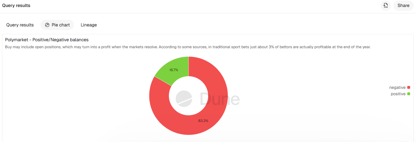 فقط حوالي 16.7% من المحافظ في Polymarket تحقق أرباحًا، بينما تكبدت 83% المتبقية خسائر، وفقًا لبيانات blockchain من Dune.