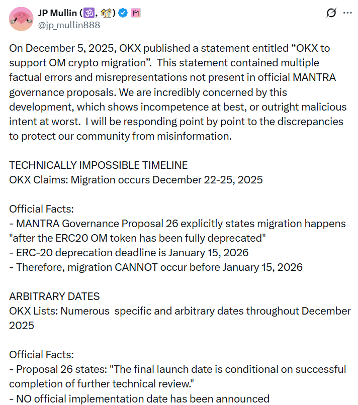 وقال مولين أيضًا إن منشور OKX أشار إلى “تواريخ عشوائية طوال شهر ديسمبر 2025″، بينما لم تعلن Mantra بعد عن تاريخ التنفيذ الرسمي.