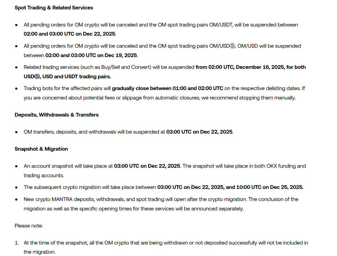 وقالت OKX إن الترحيل سيحدث في الفترة ما بين 22 و25 ديسمبر. وعلى النقيض من ذلك، ينص مقترح إدارة Mantra على أن الترحيل لن يحدث إلا بعد إيقاف رمز ERC-20 OM المستند إلى Ethereum في 15 يناير.