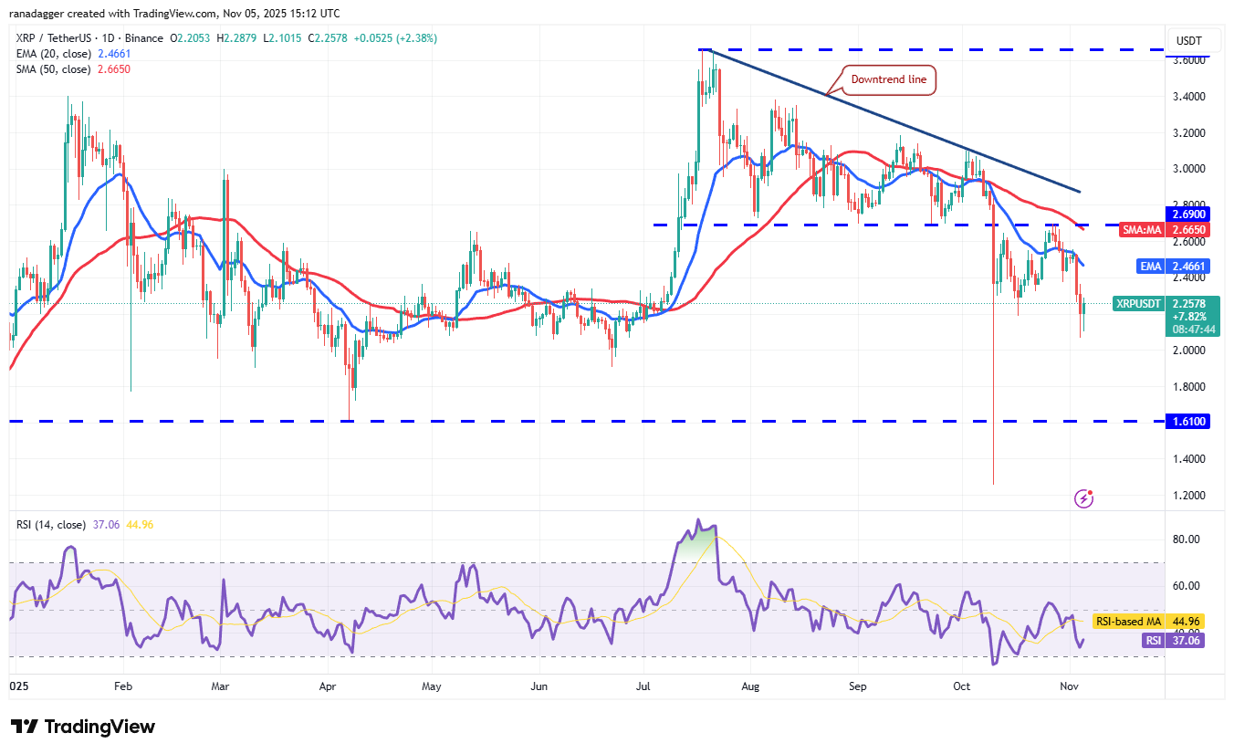 من المتوقع أن تواجه أي محاولة للتعافي عمليات بيع عند المتوسط المتحرك الأسي البالغ 20 يومًا (2.46 دولارًا). إذا انخفض السعر بشكل حاد من المتوسط المتحرك الأسي على مدى ٢٠ يومًا، فقد ينخفض زوج XRP/USDT نحو مستوى الدعم الحاسم عند 1.61 دولار. من المتوقع أن يدافع المشترون بقوة عن مستوى 1.61 دولار، حيث أن الاختراق تحته قد يؤدي إلى انخفاض الزوج إلى 1.25 دولار.