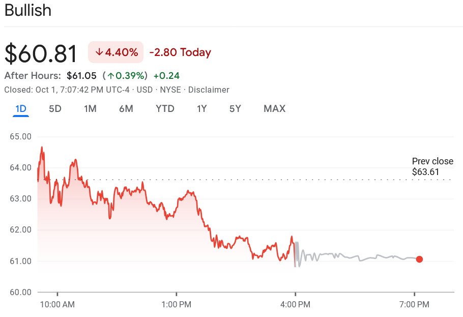 على الرغم من الأخبار ، انخفضت أسهم Bullish (Blsh) بنسبة 4.4 ٪ إلى 60.80 دولار خلال ساعات التداول يوم الأربعاء ، كما تظهر بيانات Google Finance.