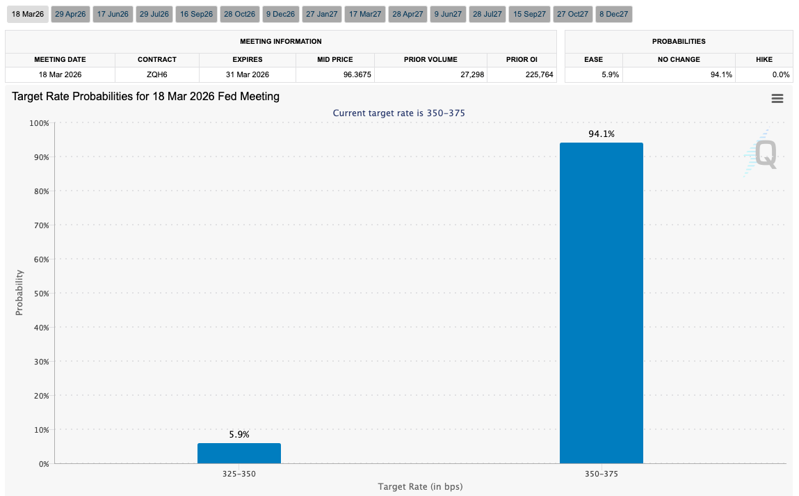 تشير أحدث البيانات الصادرة عن أداة FedWatch التابعة لمجموعة CME إلى أن احتمالات توقف سعر الفائدة مؤقتًا في مارس تزيد عن 90٪.