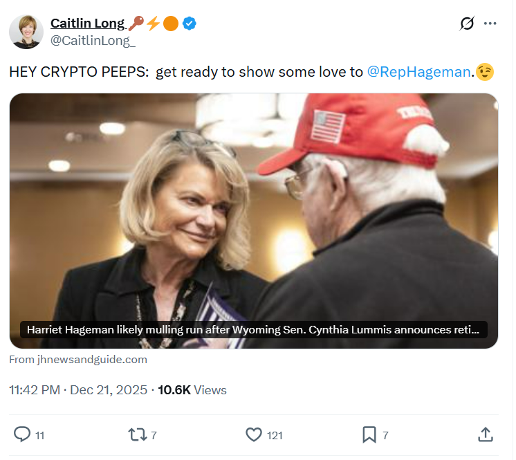 لقد دفعها مجتمع العملات المشفرة في وايومنغ بالفعل في هذا الاتجاه. وقد أشادت كيتلين لونج، مؤسس بنك Custodia Bank والمهندس الرئيسي للقوانين الصديقة لبلوكتشين في الولاية، بهيجمان ووصفه بأنه “ملح الأرض”. كان لونغ يتفاعل مع أخبار دخول هاجمان المتوقع في السباق.