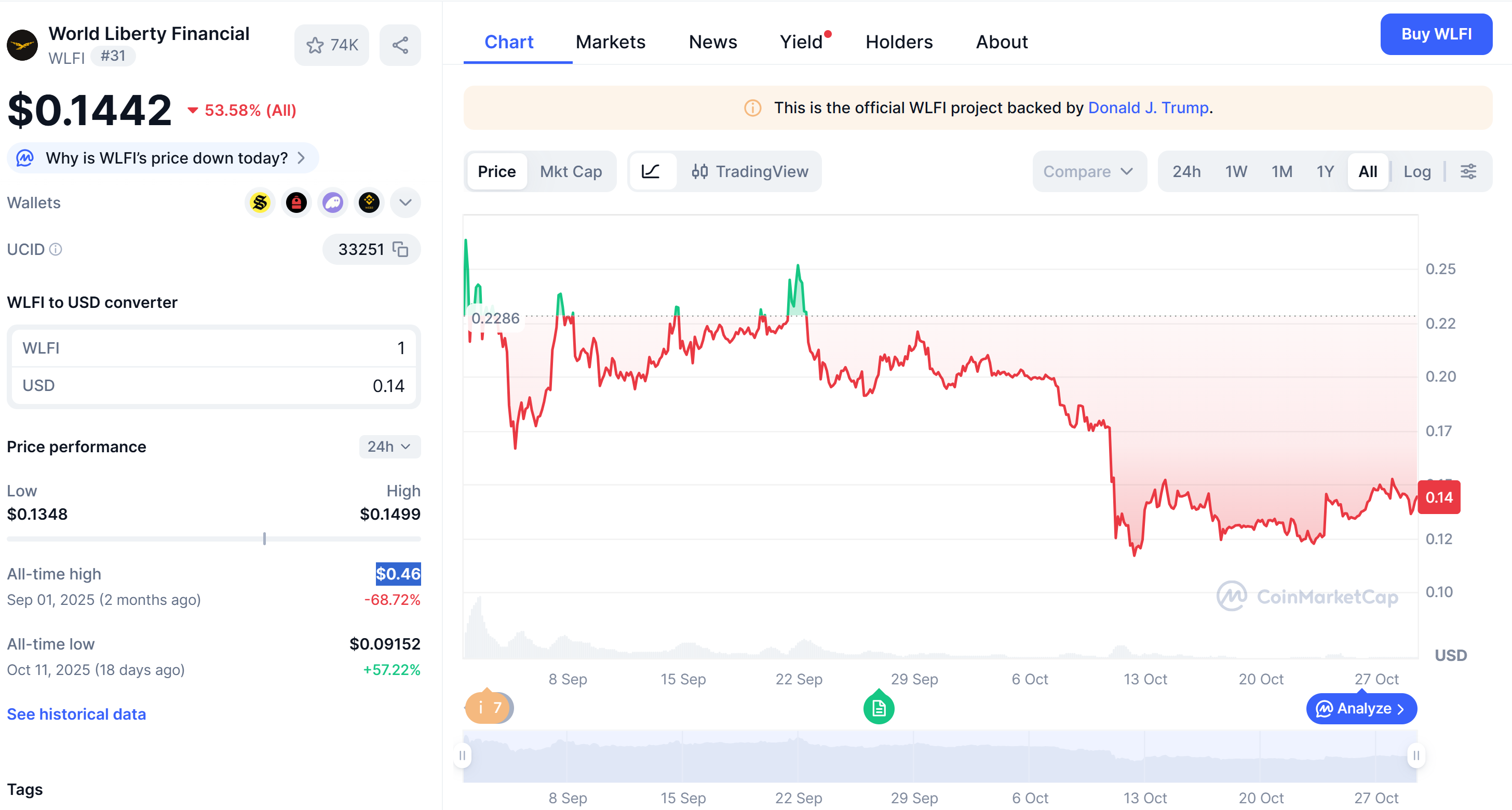 يتم تداول WLFI حاليًا عند 0.14 دولار، بانخفاض 0.5% خلال الـ 24 ساعة الماضية، حسبما تظهر بيانات من CoinMarketCap. انخفض الرمز بنسبة 70٪ تقريبًا من أعلى مستوى له على الإطلاق عند 0.46 دولار المسجل في سبتمبر.