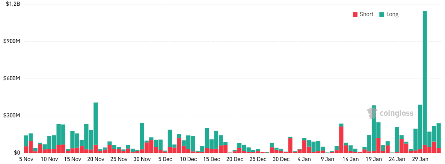 أصبح مستثمرو إيثريوم يشعرون بالقلق حيث نجت العملات المشفرة الرئيسية الأخرى من تصحيحات أقل حدة خلال الشهر الماضي؛ وانخفضت بيتكوين (BTC) بنسبة ١٧٪، وانخفضت عملة BNB (BNB) بنسبة ١٤٪، وانخفضت ترون (TRX) بنسبة ٤٪. أدى الانخفاض الأسبوعي للإيثريوم إلى 2110 دولارات إلى تصفية أكثر من 2 مليار دولار من العقود الآجلة الصعودية للإيثريوم ذات الرافعة المالية، مما أثار المخاوف من المزيد من الانخفاض مع تحول معنويات السوق إلى الاتجاه الهبوطي.