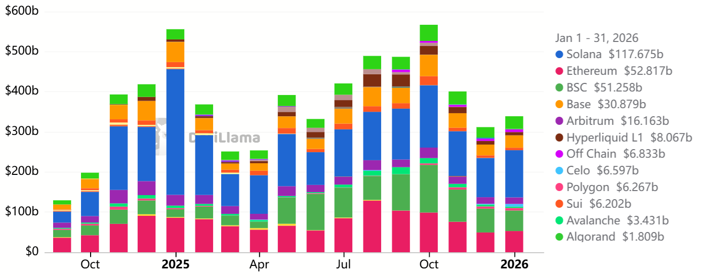 وصلت أحجام التداول في البورصات اللامركزية للإيثريوم (DEX) إلى 52.8 مليار دولار في يناير، وهو انخفاض حاد من 98.9 مليار دولار في أكتوبر 2025. وهذا الانخفاض في النشاط بنسبة 47٪ يقلل من حوافز حاملي العملات؛ عادة، يؤدي الطلب المرتفع على معالجة البلوكتشين إلى تشغيل آلية حرق الشبكة، مما يؤدي إلى تقليص إجمالي المعروض من الإيثريوم.