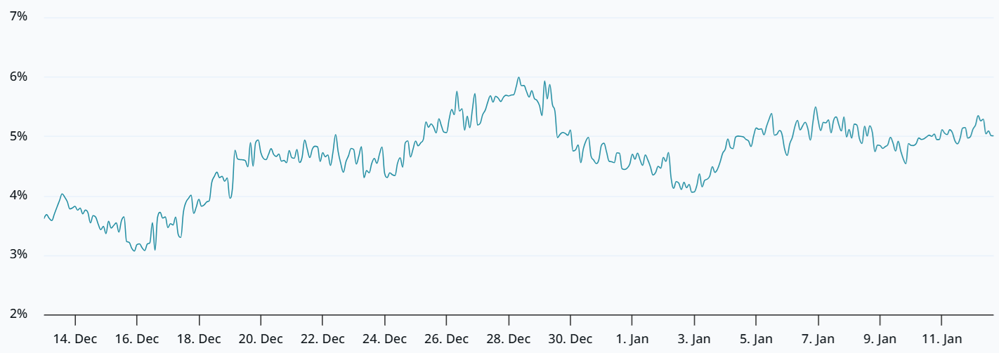 في حين أن عملة البيتكوين قد تعمل كأداة تحوط بديلة للنظام المالي التقليدي، إلا أن هناك القليل من الأدلة على أن أزمة الثقة في الدولار الأمريكي بدأت تتكشف. وعلى الرغم من العجز المالي الذي بلغ 601 مليار دولار والذي تم تسجيله في الأشهر الثلاثة الأخيرة من عام 2025، فقد احتفظ دين الحكومة الأمريكية بوضعه عند الدرجة الاستثمارية. وفي الوقت نفسه، ظلت العائدات على سندات الخزانة لأجل 5 سنوات أقل من 3.8٪ خلال الشهرين الماضيين.