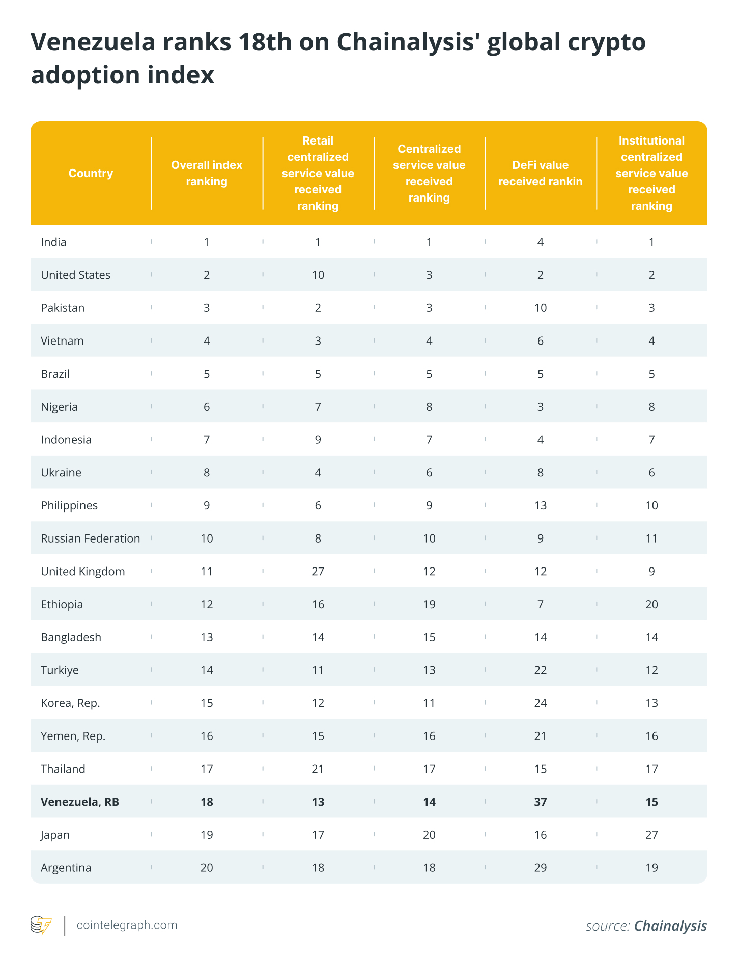 تضيف بيانات التبني إلى الصورة. تقع فنزويلا بين القادة في استخدام التشفير على مستوى القاعدة ، حيث تأخذ stablecoins حصة متزايدة من التحويلات اليومية.