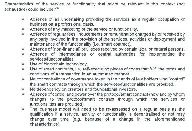 وهناك نقطة محورية أخرى في تقرير المجموعة الثالثة وهي تأهيل الخدمات المقدمة “بطريقة لامركزية بالكامل دون أي وسيط” بموجب MiCA.