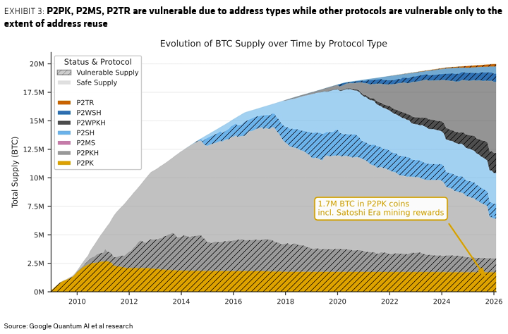 ويتجلى الخطر بشكل خاص بالنسبة للمحافظ “القديمة” القديمة. يتم الاحتفاظ بما يقرب من 1.7 مليون بيتكوين، بما في ذلك ما يقدر بنحو 1.1 مليون بيتكوين منسوبة إلى ساتوشي ناكاموتو، في عناوين P2PK المبكرة، حيث تكون المفاتيح العامة مكشوفة بشكل دائم.