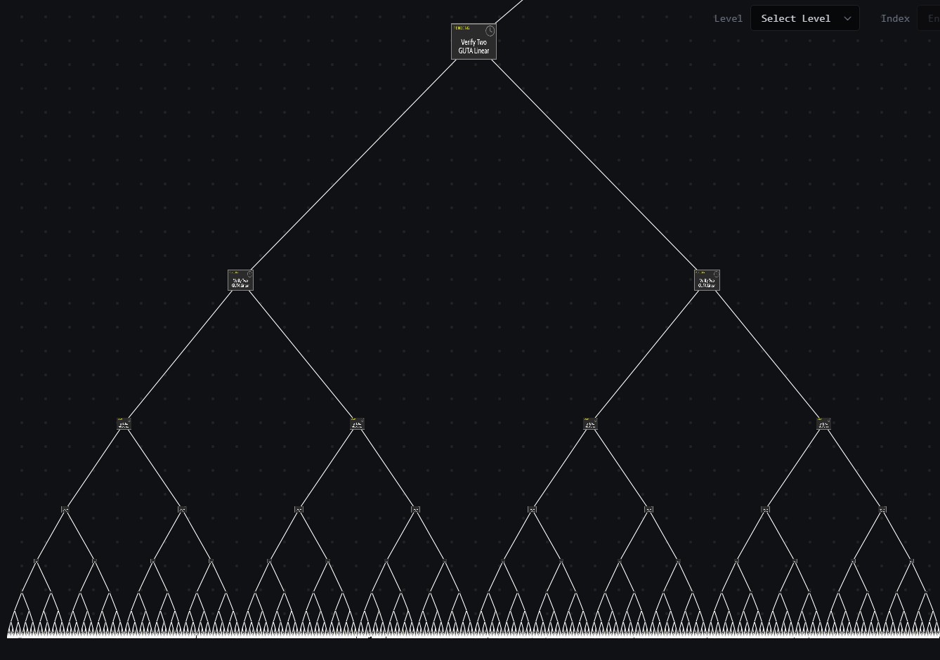 “لنفترض أننا بدأنا بمعاملات 16 مستخدمًا. وأوضح فيلدمان أثناء مشاركة رسم بياني لشجرة إثبات حيث تصبح الأدلة المتعددة في النهاية واحدة.