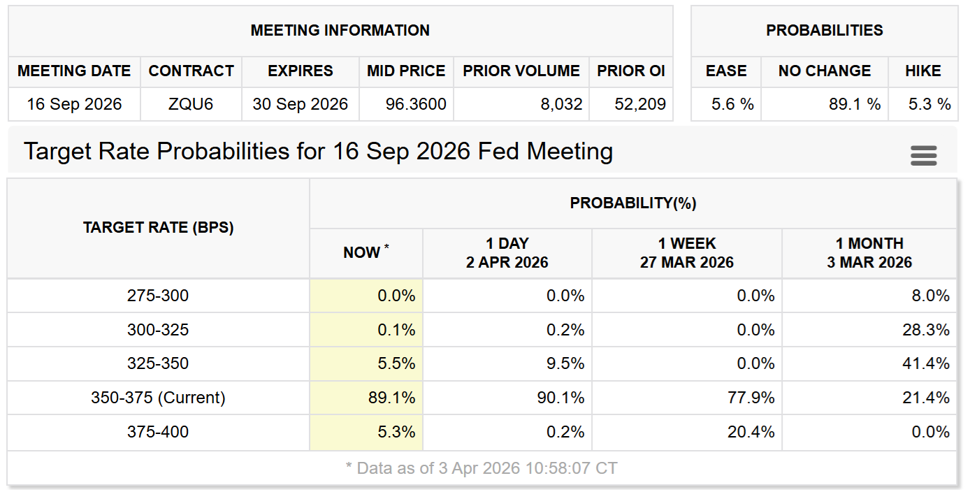 يتوقع المتداولون أن يبقي بنك الاحتياطي الفيدرالي أسعار الفائدة ثابتة حتى سبتمبر بنسبة 89%، مع احتمال بنسبة 5% برفعها إلى 4%.