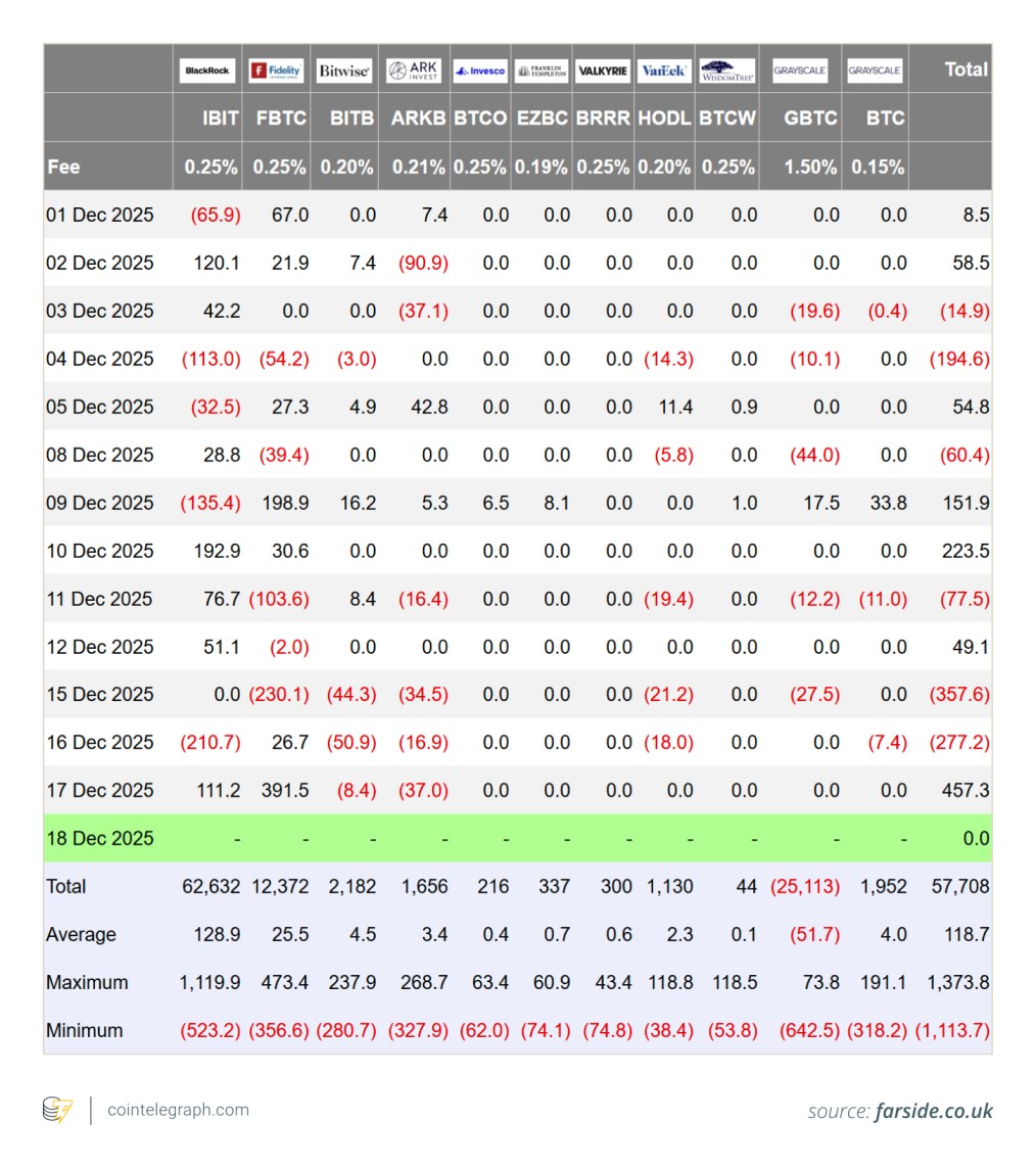 للحصول على فحص سريع عام، يمكنك تتبع التدفقات اليومية لصناديق البيتكوين المتداولة في البورصة (ETF) في الولايات المتحدة باستخدام جداول Farside.