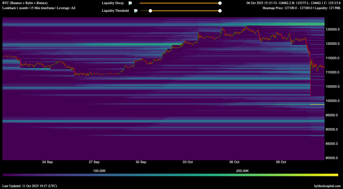 “إذا نظرنا إلى بيانات خريطة التصفية الحرارية من Hyblock Capital، والتي توضح بشكل أساسي مكان وجود جميع المراكز القصيرة والطويلة عبر دفاتر الطلبات المختلفة في بورصات العملات المشفرة المركزية، يمكننا أن نرى أن هناك جيب سيولة من المراكز الطويلة التي يتم استغلالها … ويمتد هذا الجيب من 120,000 دولار إلى 115,000 دولار ومن 115,000 دولار إلى 113,000 دولار.”