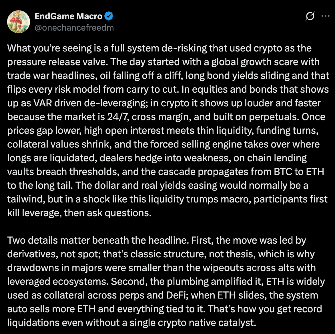 قدم مستخدم X، EndGame Macro، واحدة من أفضل النظرات العامة السياقية لما كان يحدث في الخلفية قبل الفوضى التي شهدتها أسواق العملات المشفرة.