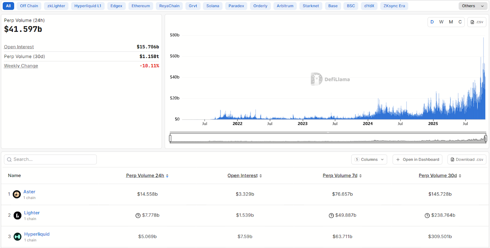 وفي الوقت نفسه، تجاوزت DEX Aster المنافسة، التي تم إطلاقها على سلسلة BNB التابعة لـ Binance، Hyperliquid لتصبح أكبر منصة DEX بحجم تداول يومي يبلغ 14.5 مليار دولار، وهو ما يفوق حجم Hyperliquid على مدار 24 ساعة تقريبًا.