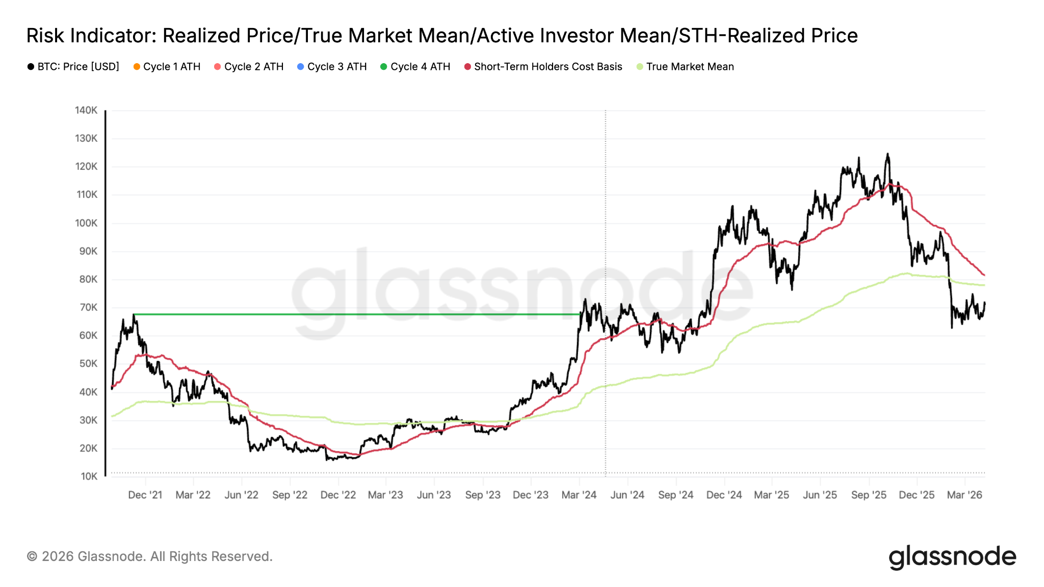 يكشف مؤشر المخاطر الخاص بـ Glassnode عن مقاومة رئيسية أخرى أعلى بين متوسط السوق الحقيقي عند 78000 دولار ومستوى أساس تكلفة الحامل على المدى القصير حوالي 80000 دولار.