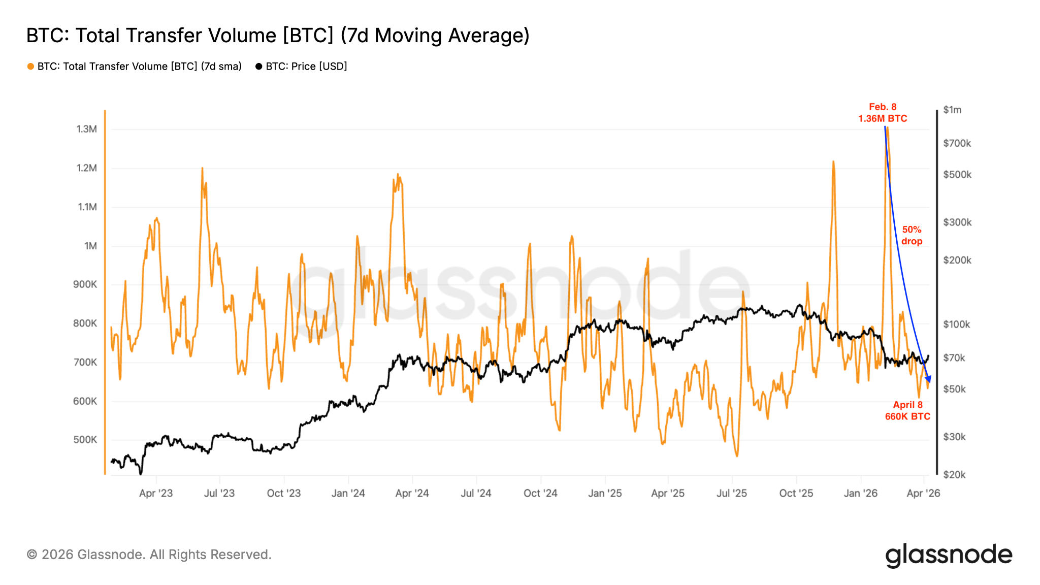 انخفض المتوسط المتحرك لمدة سبعة أيام لحجم نقل onchain بنحو 50.5٪ إلى 660.000 بيتكوين يوم الخميس، من 1.36 مليون بيتكوين قبل أقل من 30 يومًا.