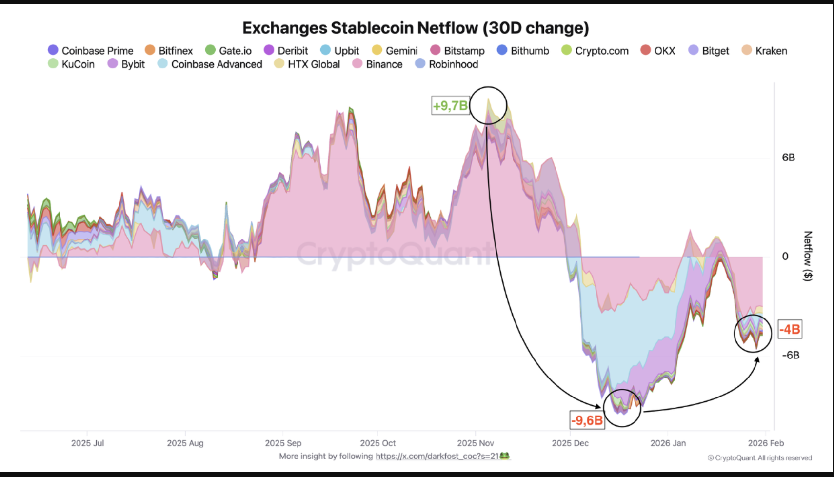 علاوة على ذلك، انقلبت تدفقات العملات المستقرة إلى البورصات بشكل سلبي بشكل حاد في أواخر عام 2025، حيث وصل صافي التدفقات الخارجية لمدة 30 يومًا إلى ما يقرب من 9.6 مليار دولار.