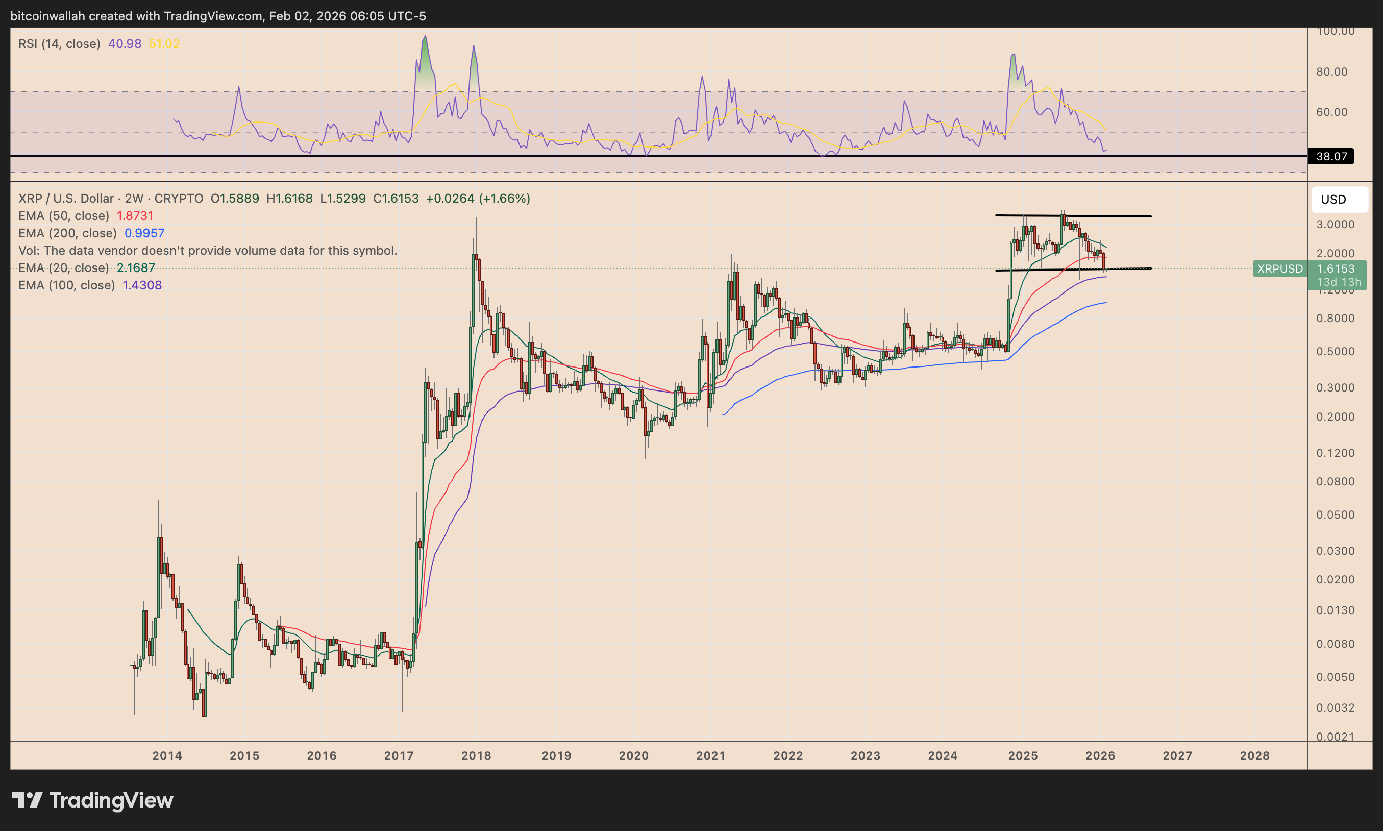 ولكن في حين أن XRP لا يزال من الممكن أن ينزلق إلى نطاق الدعم الذي يتراوح بين 1.43 و1.48 دولارًا في فبراير، فإن مؤشر القوة النسبية (RSI) لمدة أسبوعين بالقرب من 38 سبق تاريخيًا الانعكاسات.