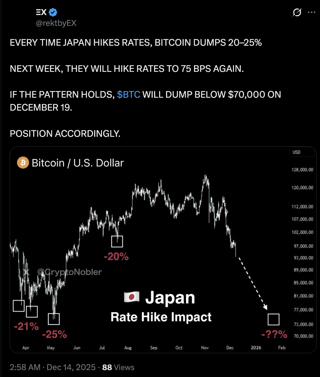 تزامن كل رفع لأسعار الفائدة من بنك اليابان منذ عام 2024 مع عمليات سحب من أسعار البيتكوين تجاوزت 20٪، وفقًا للبيانات التي أبرزتها AndrewBTC.