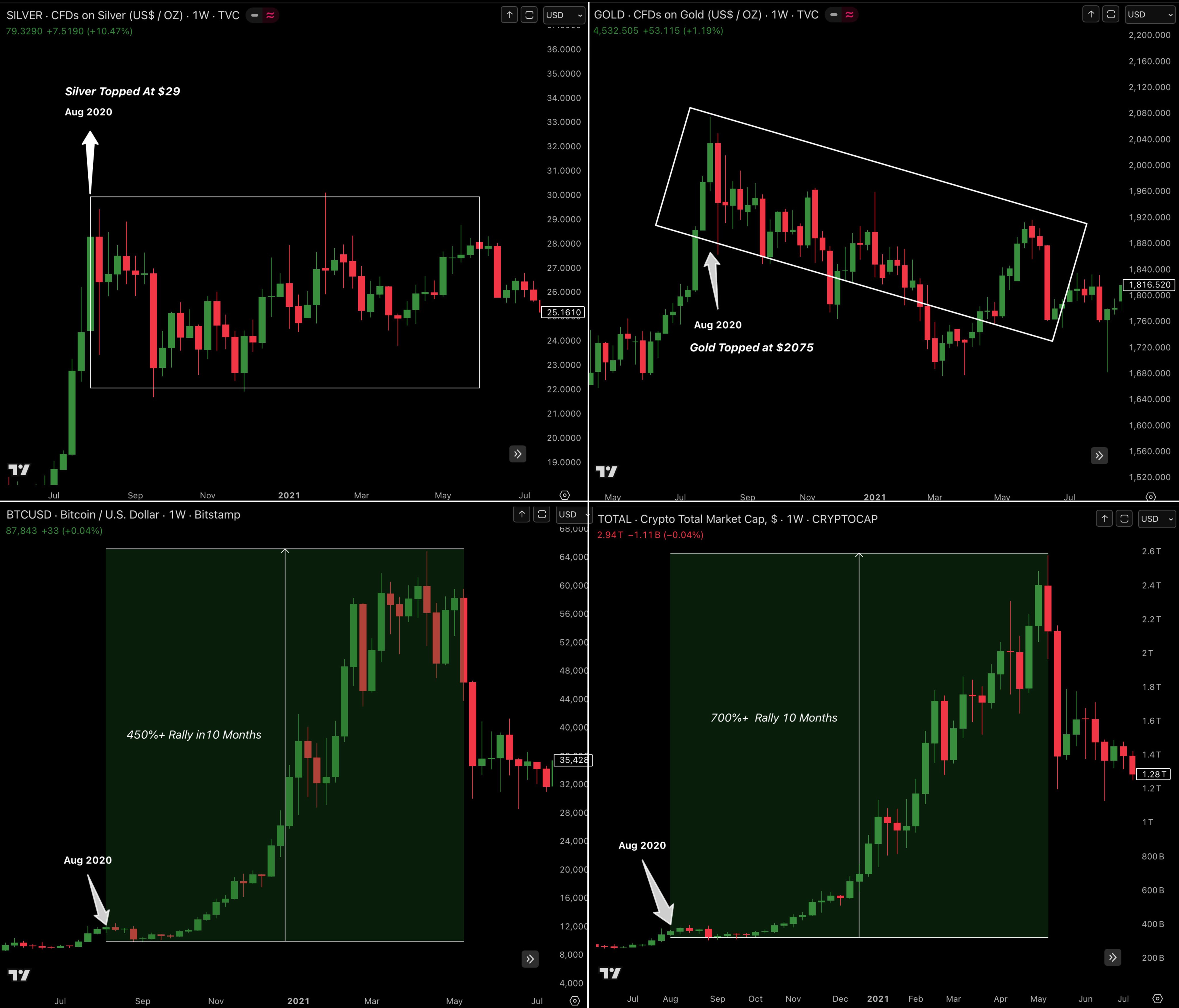 وصل الذهب والفضة إلى أعلى مستوياتهما على الإطلاق، في حين تماسكت عملة البيتكوين، مما يشير إلى أن العملة المشفرة الأعلى قد تستفيد من تأخر تناوب المخاطر تمامًا كما فعلت بعد أغسطس 2020.