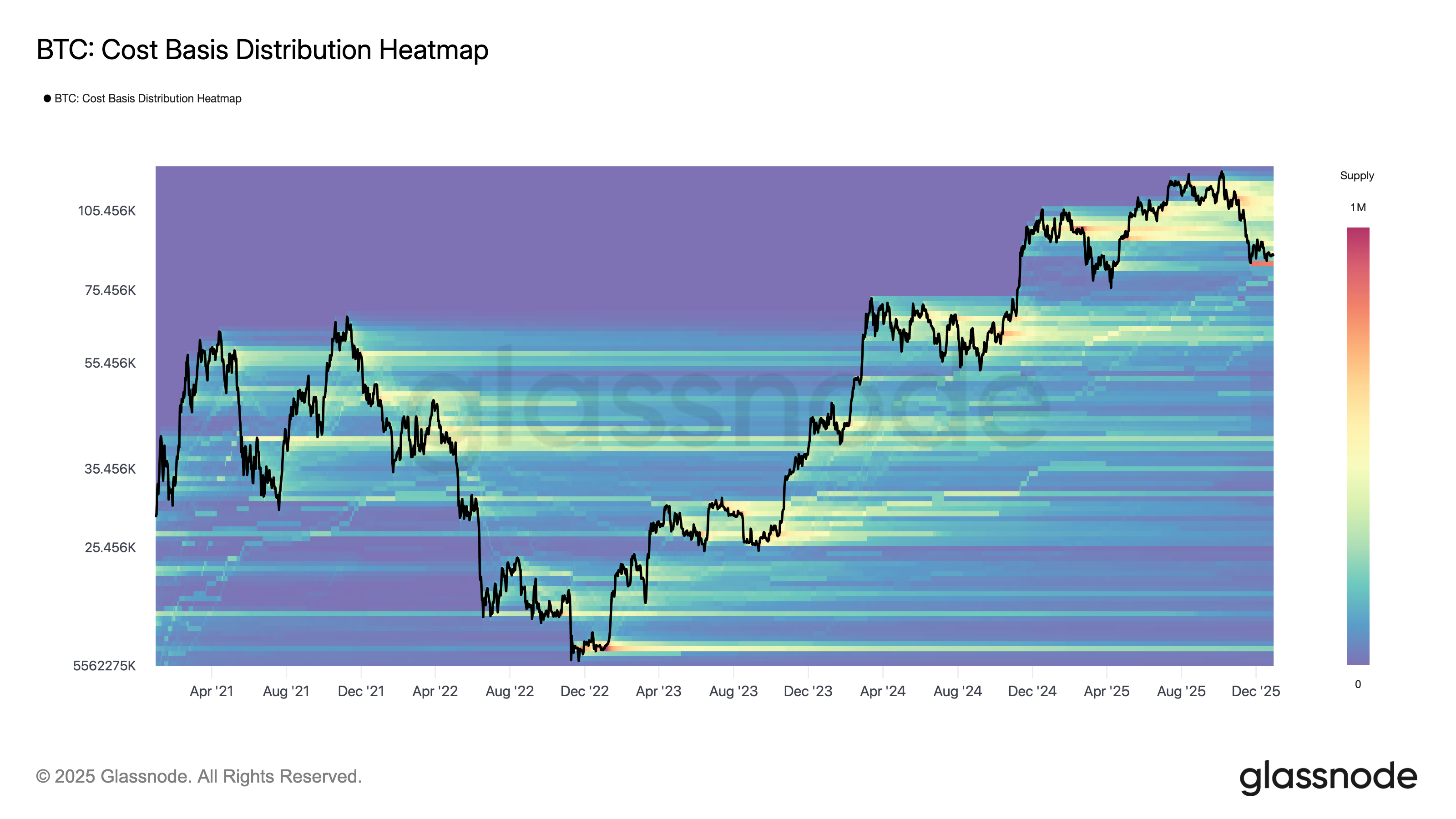 اعتبارًا من ديسمبر، سلطت الخريطة الحرارية الضوء على مجموعة إمدادات كثيفة تزيد عن 940,000 بيتكوين في نطاق يتراوح بين 84,000 دولار و85,000 دولار، وهو أكبر تركيز تم تسجيله منذ عام 2020.