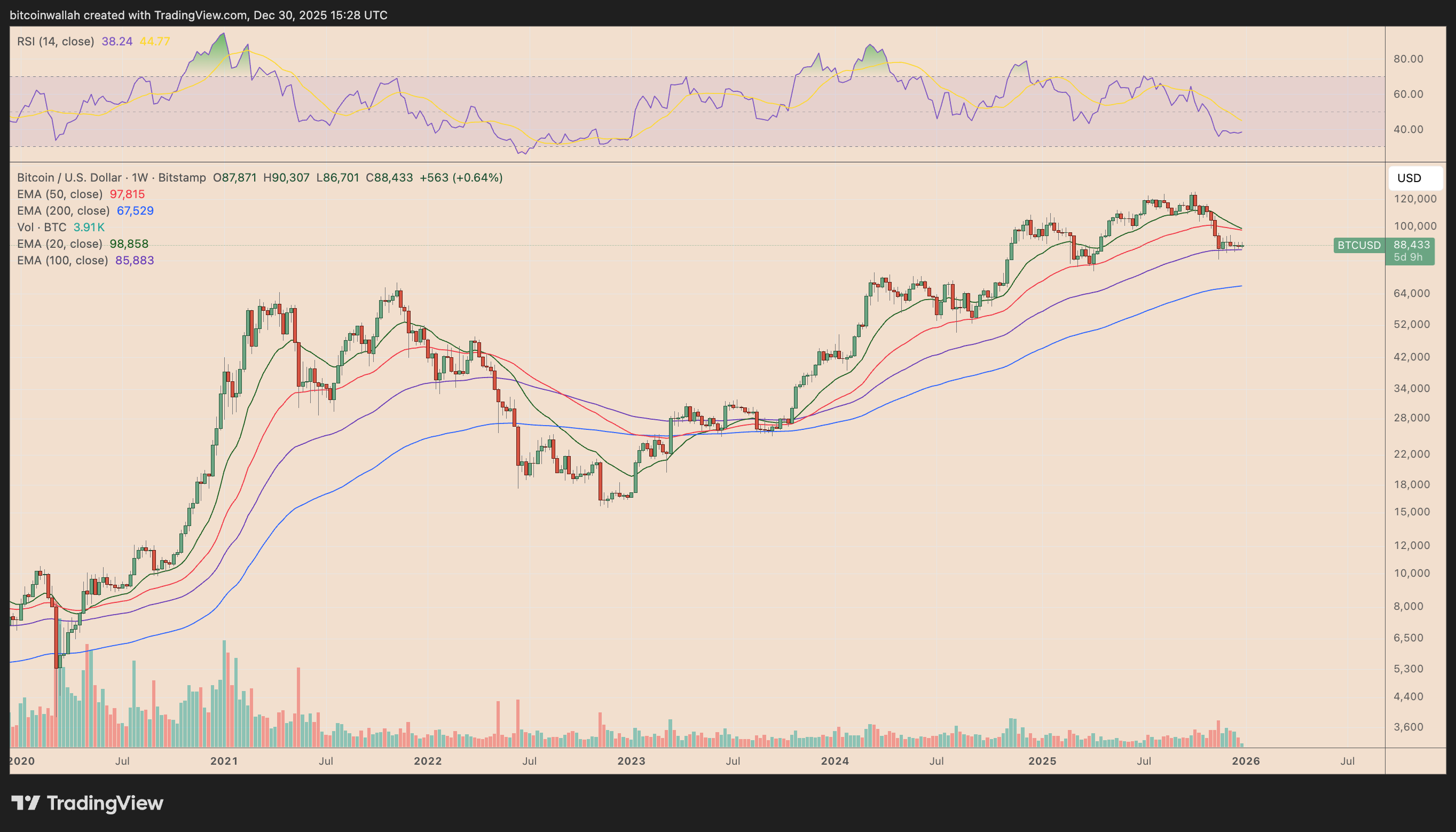 اعتبارًا من ديسمبر، تم توحيد BTC بشكل جانبي مع الحفاظ على دعم المتوسط المتحرك الأسي لمدة 100 أسبوع (EMA لمدة 100 أسبوع؛ الموجة الأرجوانية).