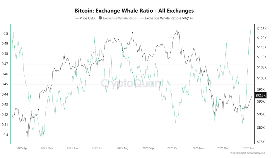 ويبلغ المتوسط المتحرك لأسبوعين لمؤشر نسبة الحيتان التبادلية، الذي يقيس نسبة التدفقات الداخلة في أكبر عشر كيانات مصدرها كيانات الحيتان، الآن أعلى مستوياته منذ مارس 2025.