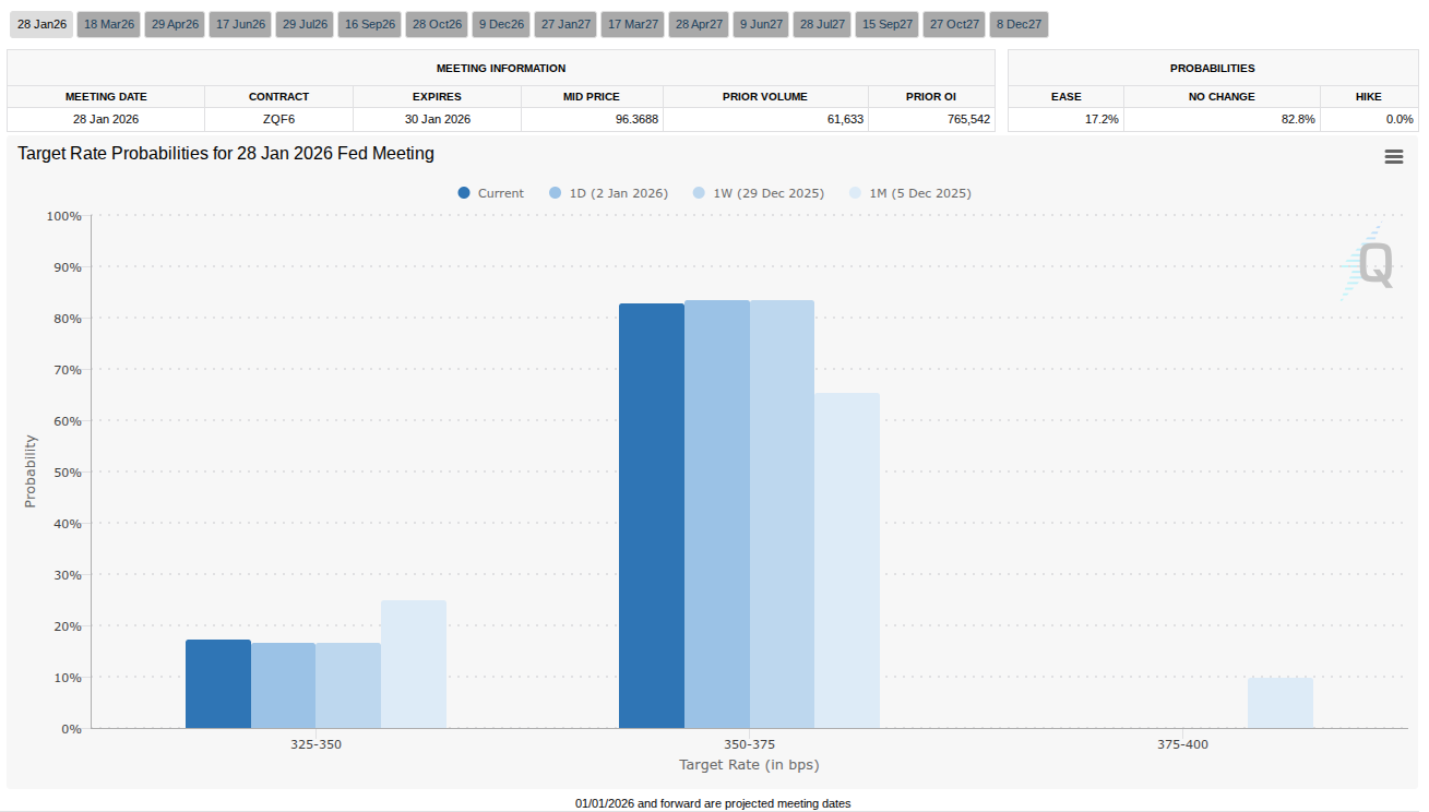 وهذا له آثار على بنك الاحتياطي الفيدرالي، الذي يجب أن يتخذ قراراً بشأن تغييرات أسعار الفائدة في اجتماعه المقرر في 28 يناير/كانون الثاني. بالنسبة للأصول الخطرة، سيكون التخفيض الآخر موضع ترحيب، لكن المعنويات لا تدعم هذه النتيجة بعد.