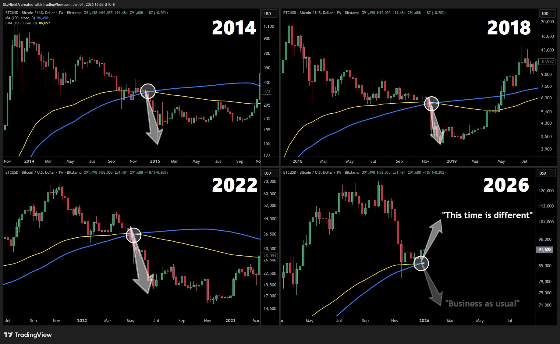 “من الناحية التاريخية، يتقاطع المتوسط المتحرك الأسي الأسبوعي 100 والمتوسط المتحرك البسيط بعمق في الاتجاه الهبوطي. وشهدت كل دورة سابقة انهيارًا بنسبة 50٪ + إلى قاع الدورة في غضون أسابيع،” كتب SuperBro على X.