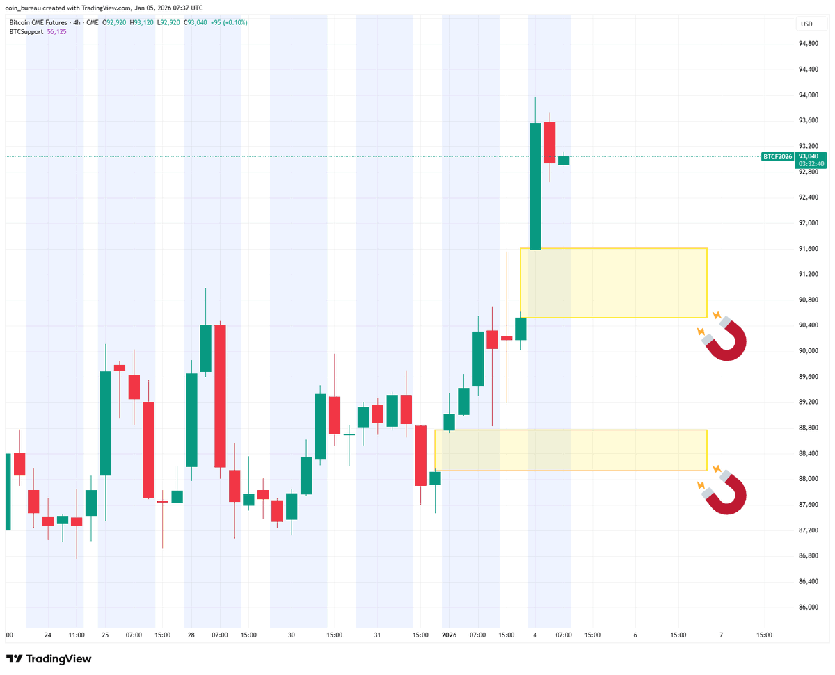 “توجد فجوتان في بورصة شيكاغو التجارية تحت السعر عند 90,500 دولار – 91,600 دولار و88,200 دولار – 88,800 دولار”، حسبما أكد Coin Bureau لمصدر تعليم البيتكوين.
